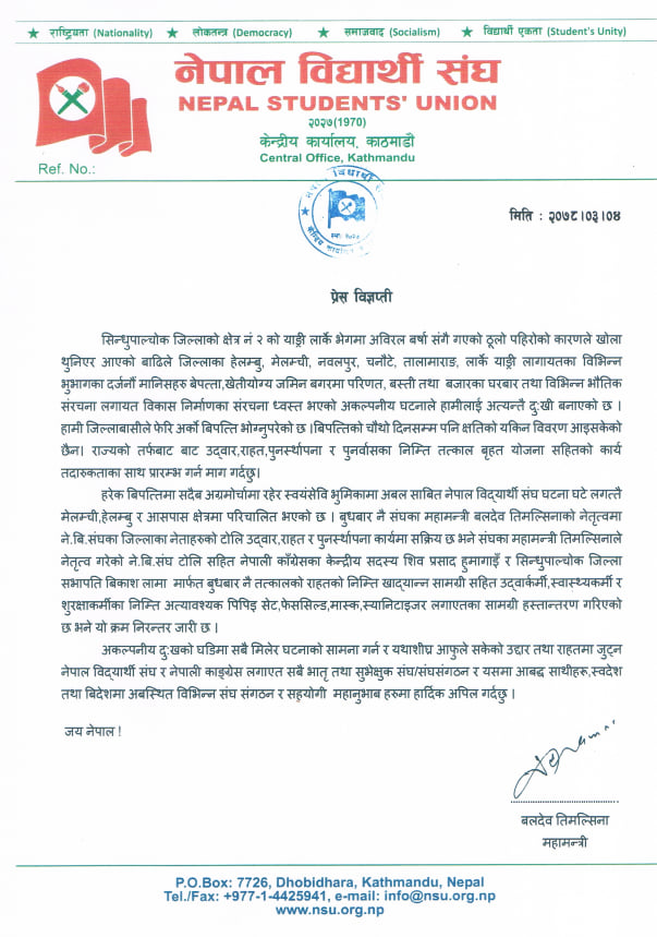 अकल्पनीय दुःखको घडिमा सबै मिलेर घटनाको सामना गर्न र यथाशीघ्र आफुले सकेको उद्दार तथा राहतमा जुट्न नेपाल विद्यार्थी संघ र नेपाली काङ्ग्रेस लगाएत सबै भातृ तथा सुभेक्षुक संघ र संघसंगठन र यसमा आबद्ध साथीहरू,स्वदेश तथा बिदेशमा अबस्थित विभिन्न संघ संगठन र सहयोगी महानुभाब हरुमा हार्दिक अपिल समेत गरेका छन् ।