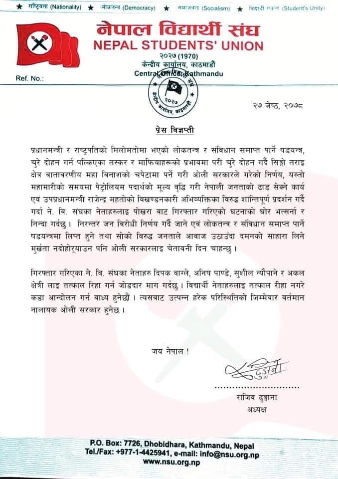 प्रतिनिधिसभा बिघटनदेखि चुरेबाट ढुंगा गिट्टी निकासी गर्ने निर्णय तथा मन्त्रिपरिषद विस्तारको विरोध गर्दै पोखरामा प्रदर्शन गरिएको थियो । प्रदर्शनमा प्रहरीले हस्तक्षेप गरि पोखरा बाट नेबिसंघका नेताहरु दिपक वाग्ले, अनिष पाण्डे, सुशील न्यौपाने र अकल क्षेत्री लाई गिरफ्तार गरेको छ । प्रदर्शन गरेका उनीहरुलाई प्रहरीले तितरबितर पारेको । मन्त्रिपरिषद विस्तारपछि सरकारको बिरोध गर्दै बिद्यार्थीहरुले निरन्तर बिरोध प्रदर्शन गर्दै आएका छन् ।