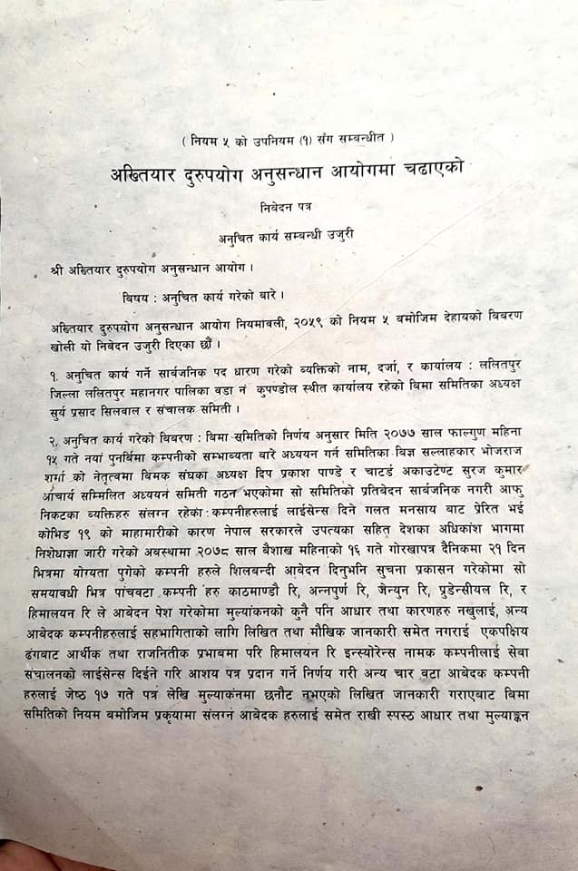 रि इन्स्योरेन्स कम्पनी दर्ता गर्दा सरकारले ब्यापक रुपमा चलखेल गरी ठूलो मात्रामा आर्थिक अनियमिता गरेको पाइएकाले तत्काल छानबिन गरि दोषी लाई कारबाहीको माग गर्दै संयुक्त विद्यार्थी संगठनको तर्फबाट बिहीबार अख्तियारमा उजुरी दर्ता गरिएको हो।